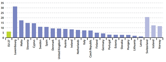 Relativamente ao número de imigrantes por cada mil habitantes, destaca-se o Luxemburgo com cerca de 30 indivíduos por cada mil habitantes, seguindo-se a Suíça com 20 imigrantes em cada mil, e Malta com 18 estrangeiros por cada mil habitantes. Importa ainda destacar a Látvia, a Lituânia e a Hungria que apresentam o menor número de imigrantes por cada mil habitantes (Eurostat, 2012:138 – 142).